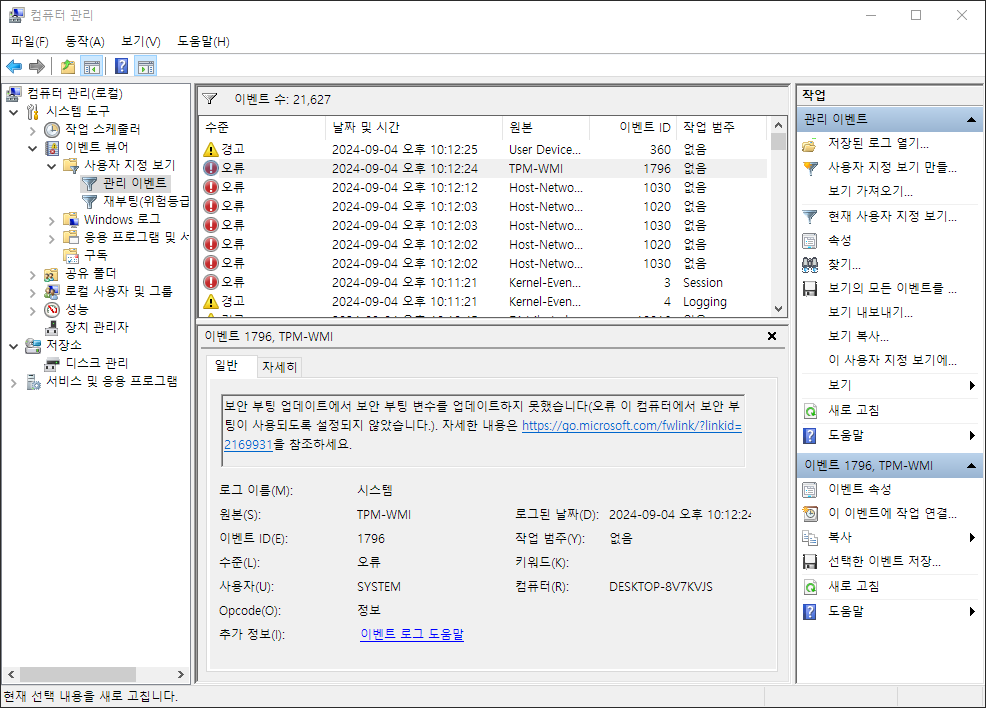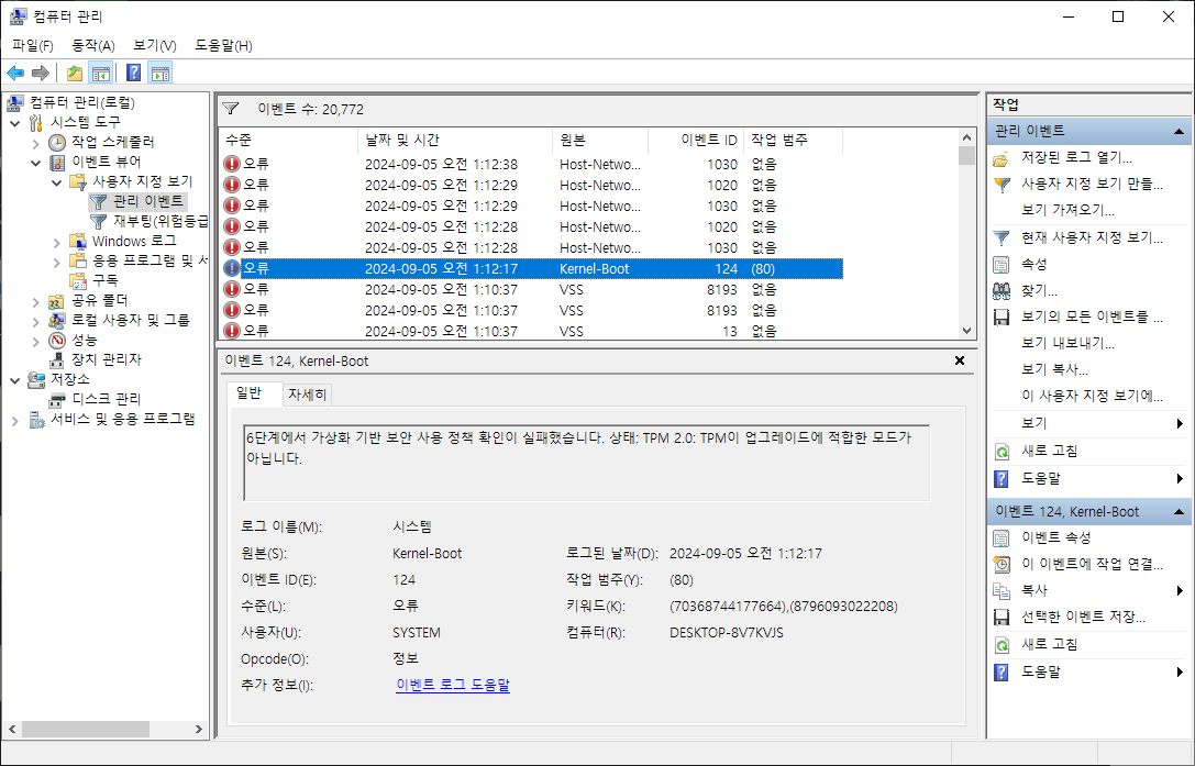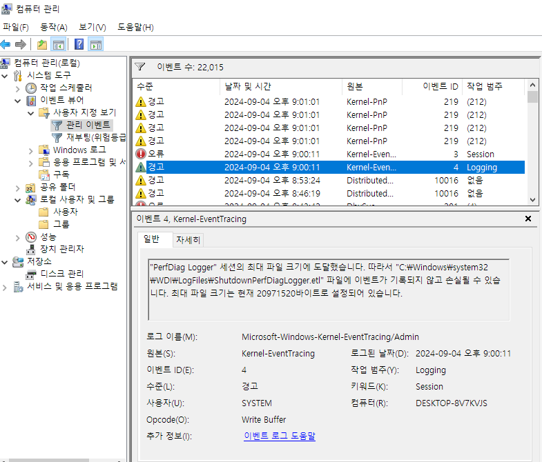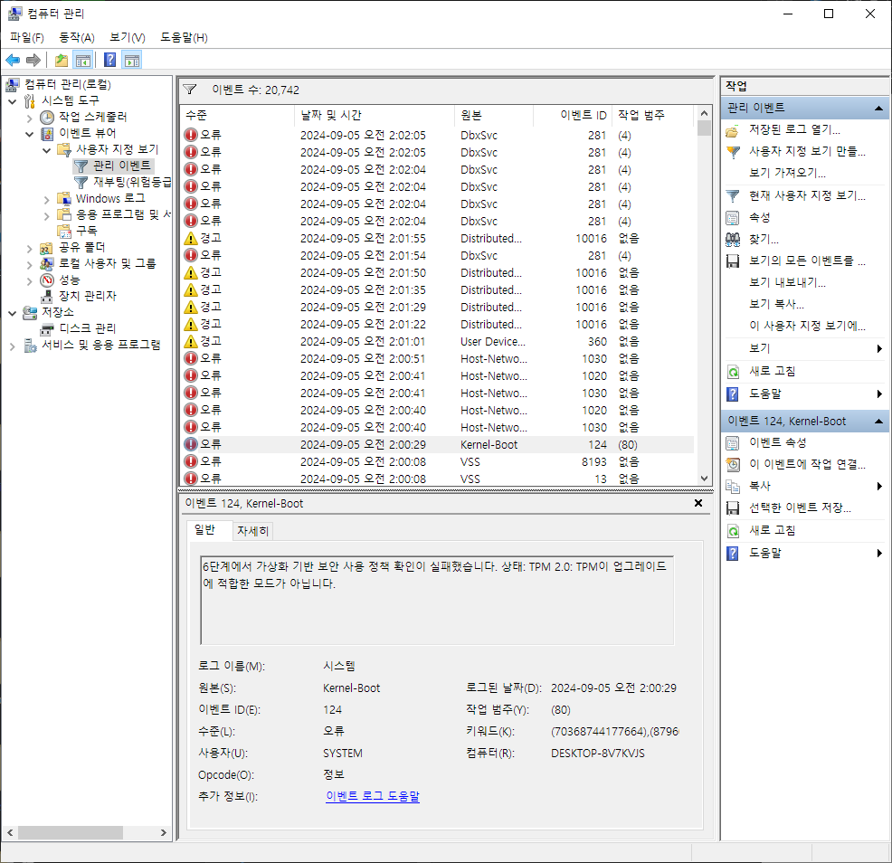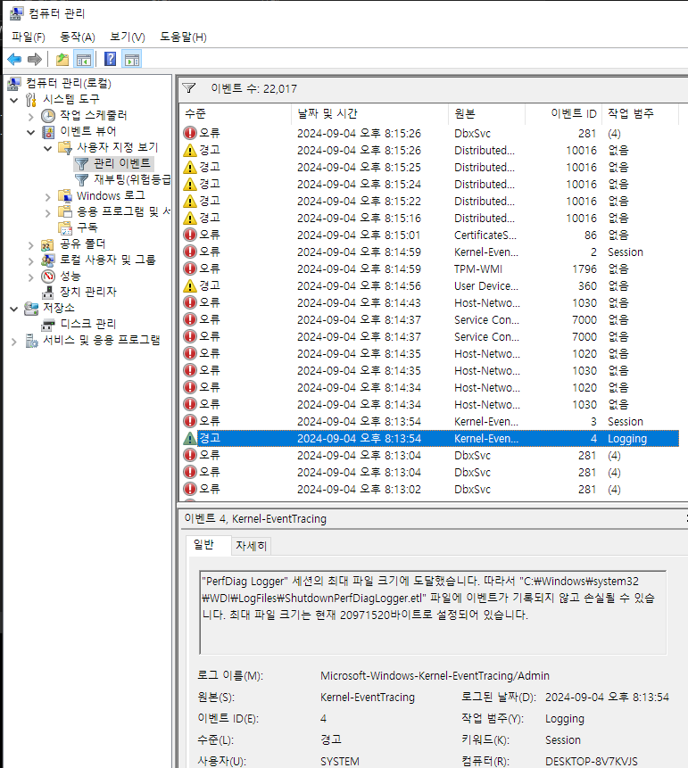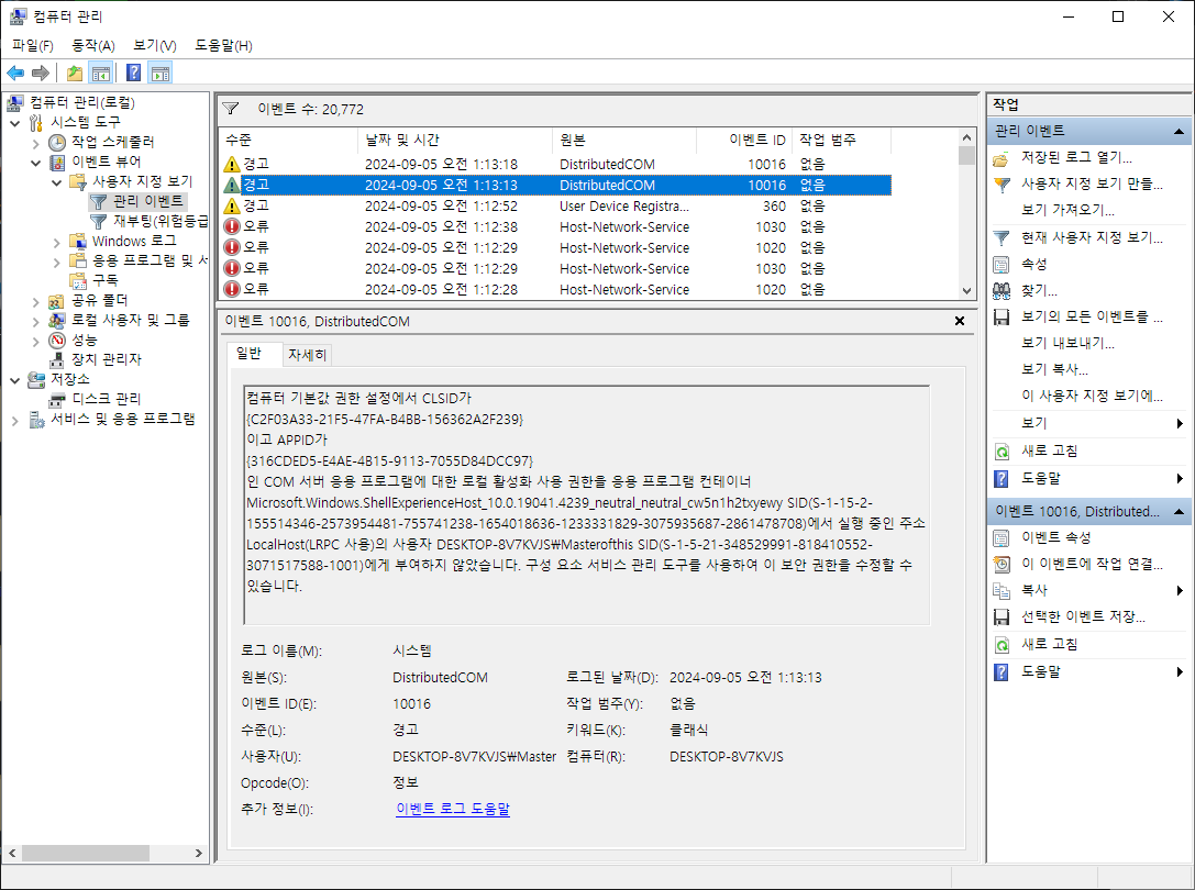 Windows 10인 상황이고 시작버튼 우클릭-컴퓨터 관리 를 눌러서 이벤트 뷰어를 확인한다. 다양한 경고와 오류를 확인할 수 있었다. 이참에 뿌리를 뽑아버리려고 한다.