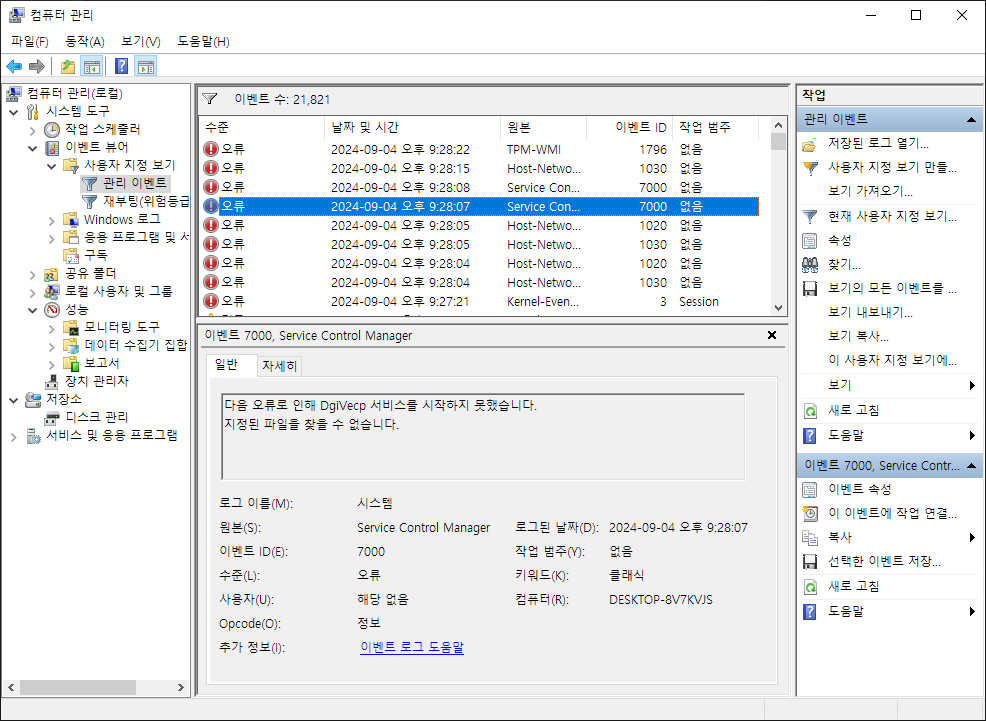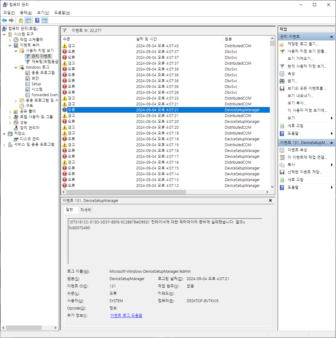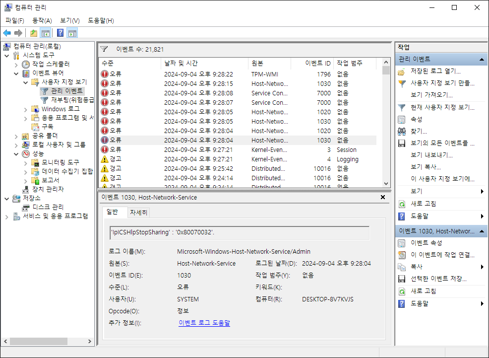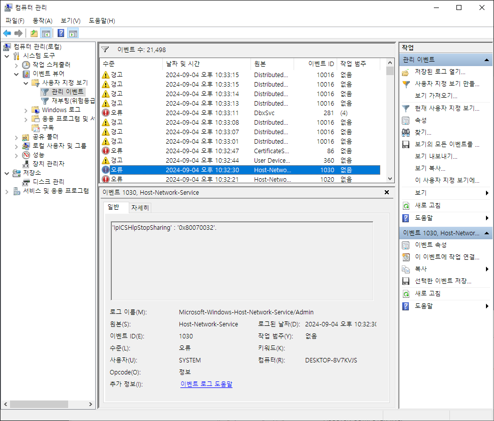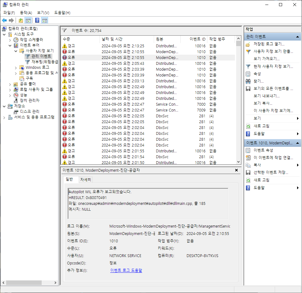 Windows 10인 상황이고 시작버튼 우클릭-컴퓨터 관리 를 눌러서 이벤트 뷰어를 확인한다. 다양한 경고와 오류를 확인할 수 있었다. 이참에 뿌리를 뽑아버리려고 한다.