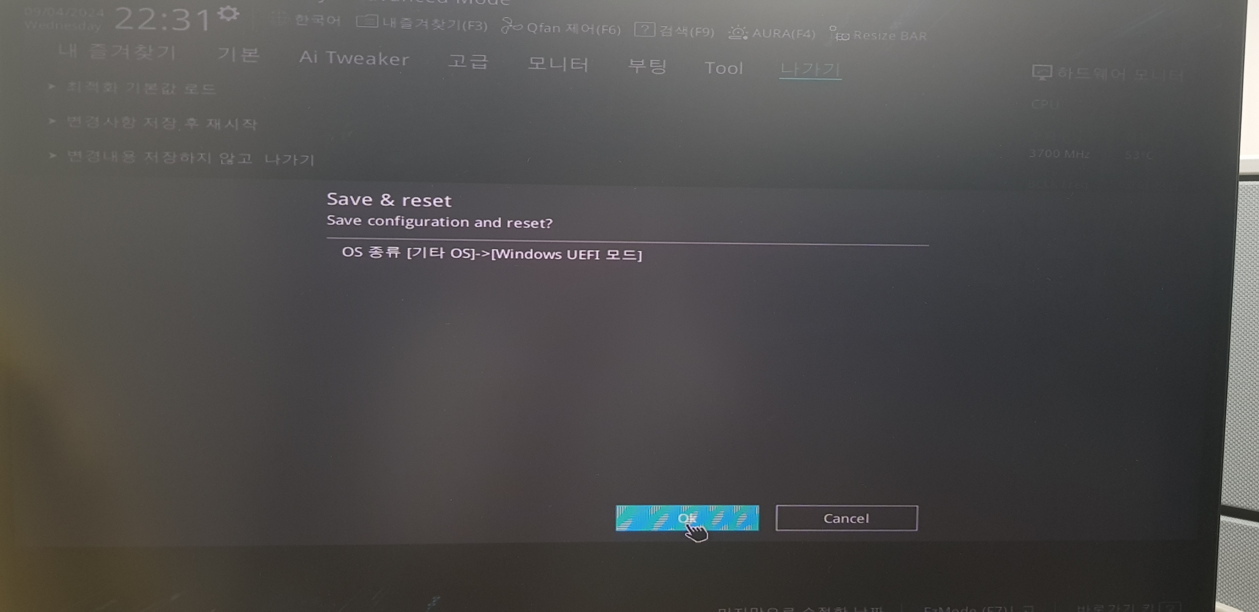 UEFI 모드로 들어갔다. 참고로 ASUS 메인보드이며, 메인보드 제조사별로 메뉴가 다를 수 있다.