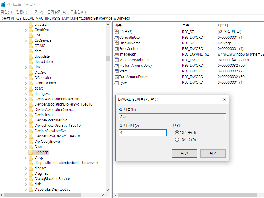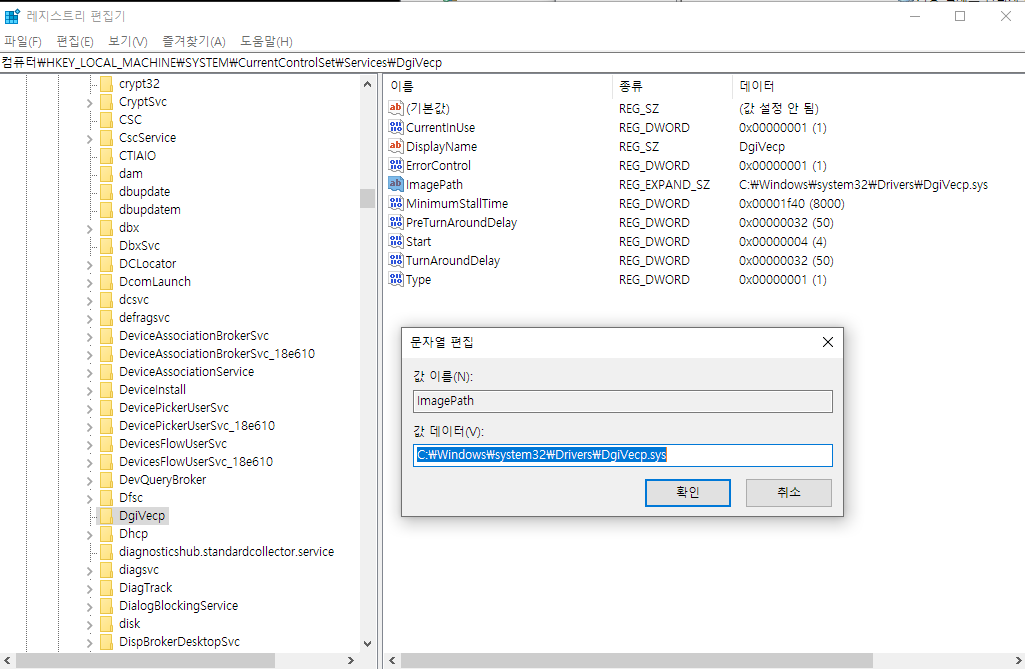 오류내용: 다음 오류로 인해 DgiVecp 서비스를 시작하지 못했습니다. 지정된 파일을 찾을 수 없습니다.