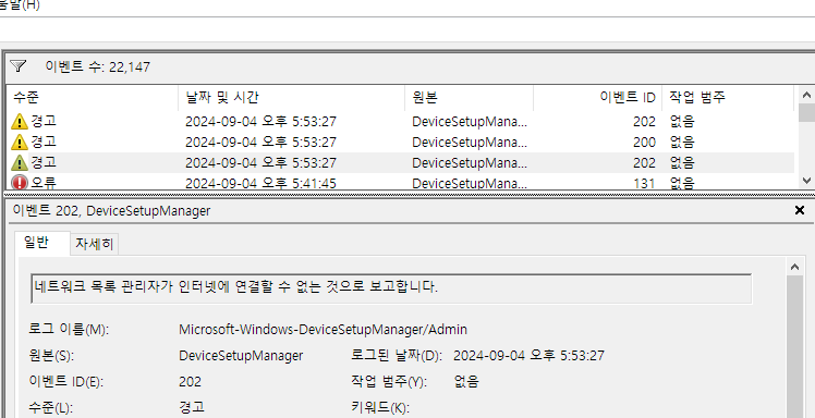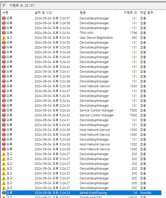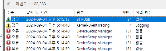 결과: BTHUSB 경고는 사라짐. 그러나 Kernel-EventTracing오류는 여전히 존재. 즉 BTHUSB 경고는 USB 허브 관련 문제였던 것으로 생각.