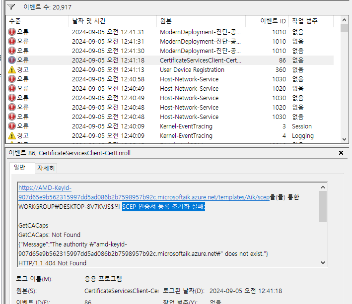 오류내용: https://AMD-KeyId-907d65e9b562315997dd5ad086b2b7598957b92c.microsoftaik.azure.net/templates/Aik/scep을(를)\DESKTOP-8V7KVJS$의 SCEP 인증서 등록 초기화 실패: