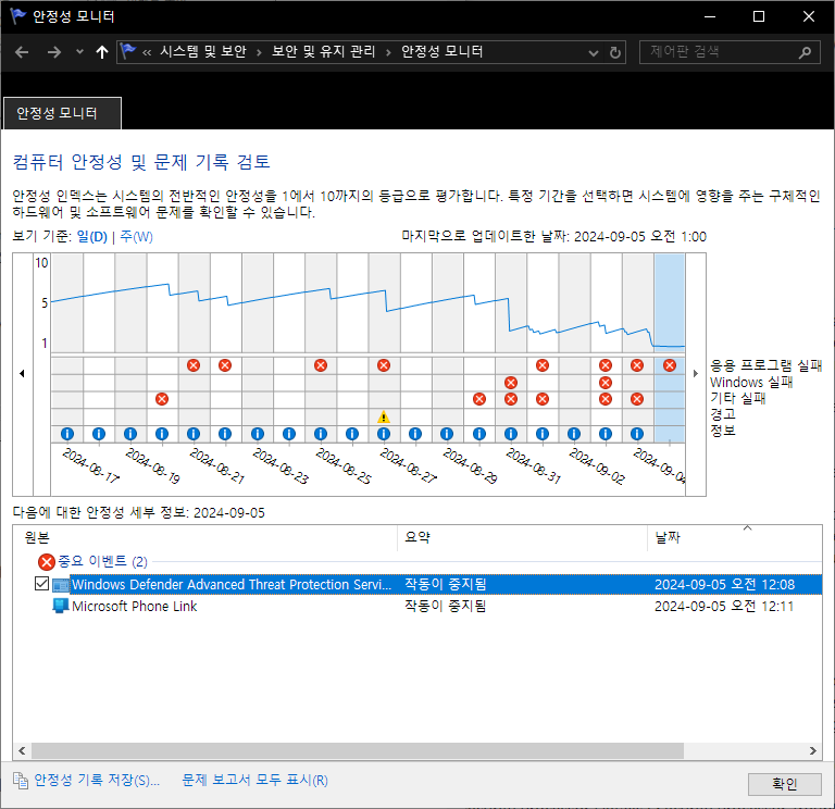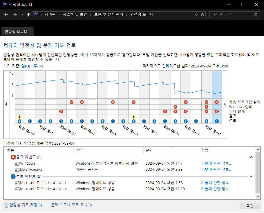 위 작업을 하면서 수없이 많은 오류와 시행착오를 겪었다. 안정성 평가를 다시 돌려 보니 아래와 같이 안정성이 1까지 떨어졌는데, 일단 강제 재부팅되는 현상 및 원인을 알 수 없는 오류는 대충 다 잡았다고 생각이 든다. 응용 프로그램 실패도 시도 8에서 삽질한 것 때문에 발생한 것으로 생각하며, 안정성이 시간에 따라 올라갈지 추이를 볼 예정이다.