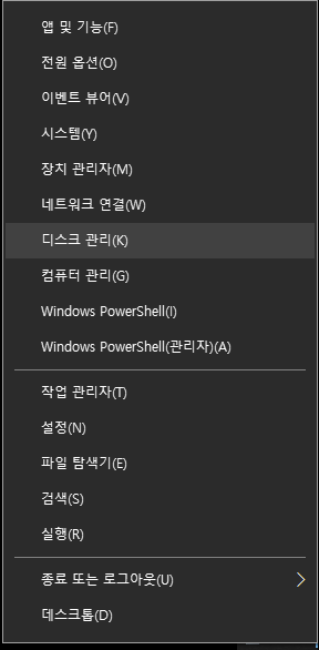 시작 버튼 우클릭 - 디스크 관리