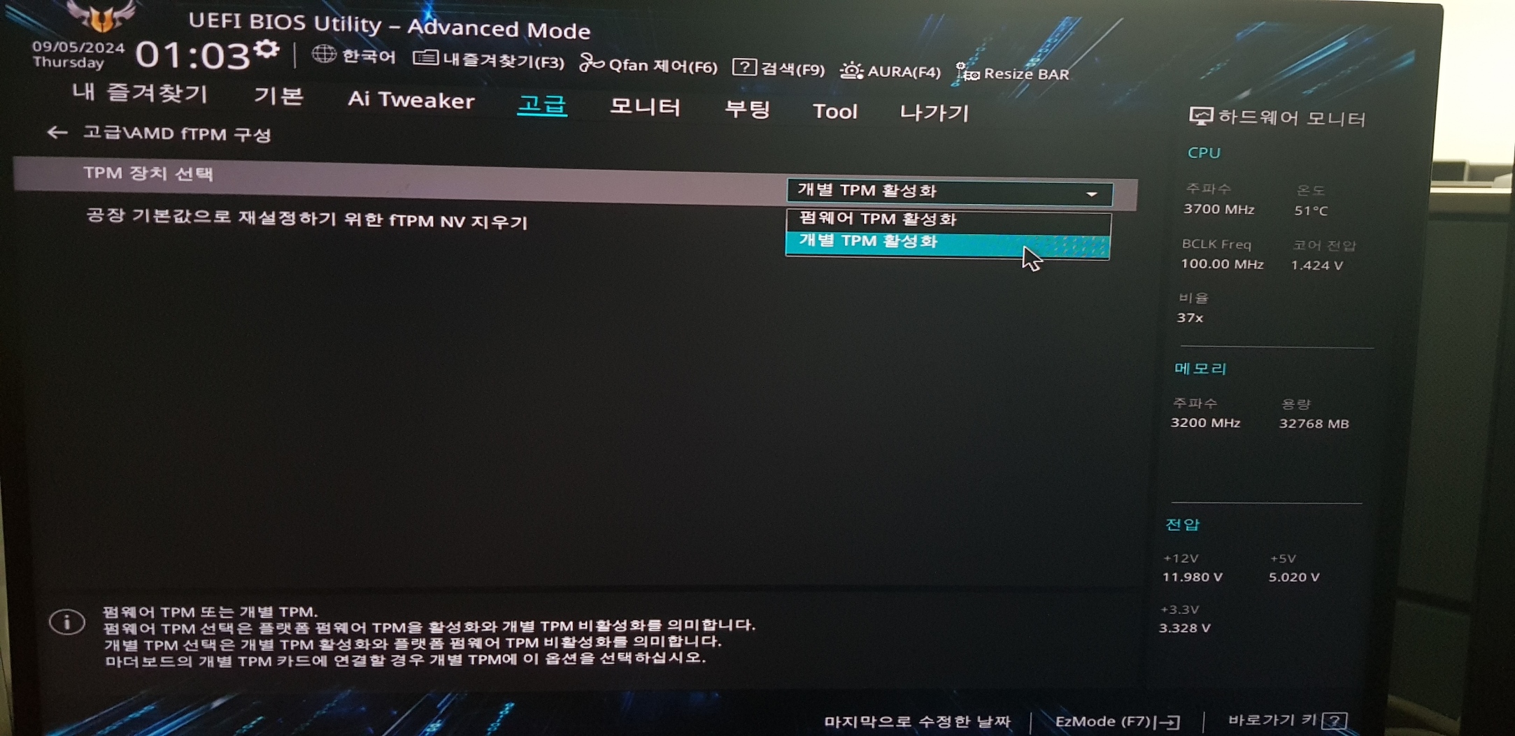 고급 - AMD fTPM 구성 - 개별 TPM 활성화