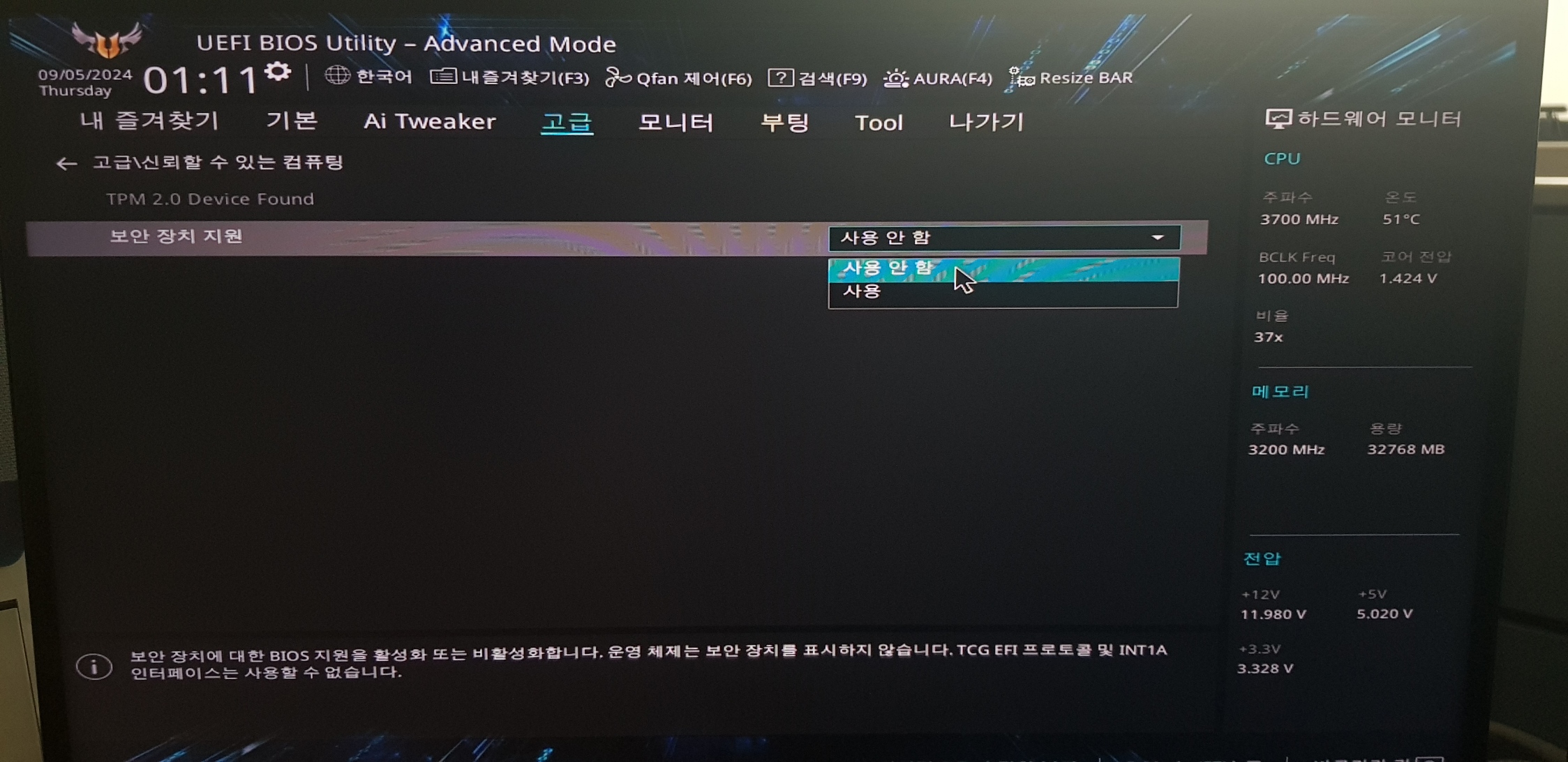 ASUS 메인보드 기준 fTPM 비활성화 방법은 다른 사람 블로그를 참고하였다.