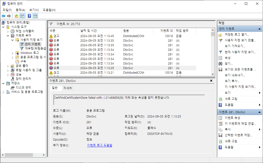 5. 다수의 Dropbox CertFindCertificateInStore fail 에러 = dropbox가 하는 일을 윈도우즈가 오류로 기록함. dropbox 직원이 일단은 문제 없다고 했음.