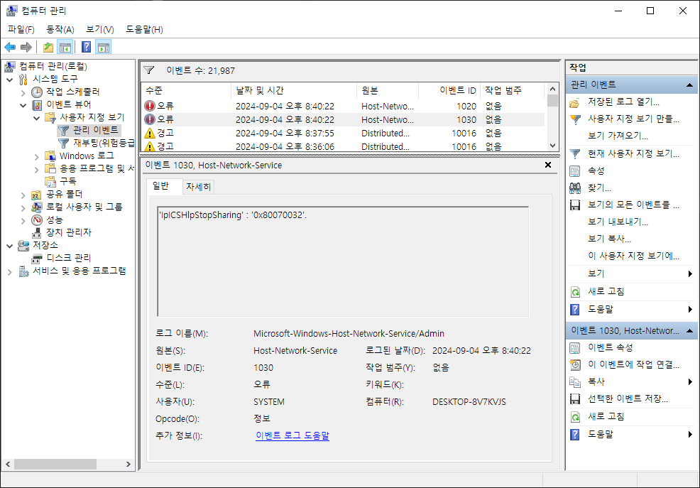 2. Host Network Service IpICSHlpStopSharing 오류 여러 개 = 원인불명, 못없앰