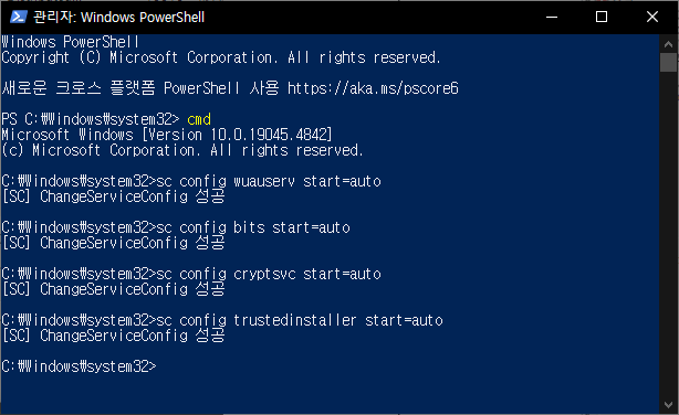 시작 버튼 우클릭 - 관리자 권한 powershell - cmd입력