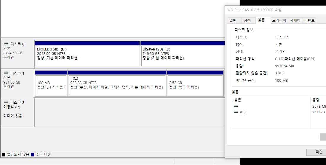 윈도우 들어있는 드라이브 (주로 C드라이브) 가 있는 디스크 왼쪽 디스크 1을 우클릭하여 속성 보기