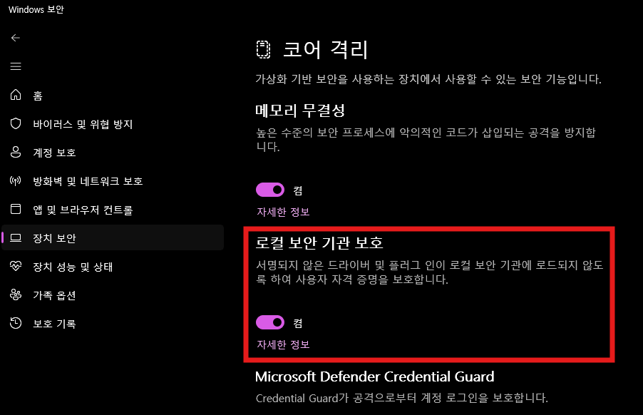 2. 새 창으로 Windows 보안 창이 뜸. 장치 보안 - 코어 격리 - 로컬 보안 기관 보호 켬에서 끔으로 전환