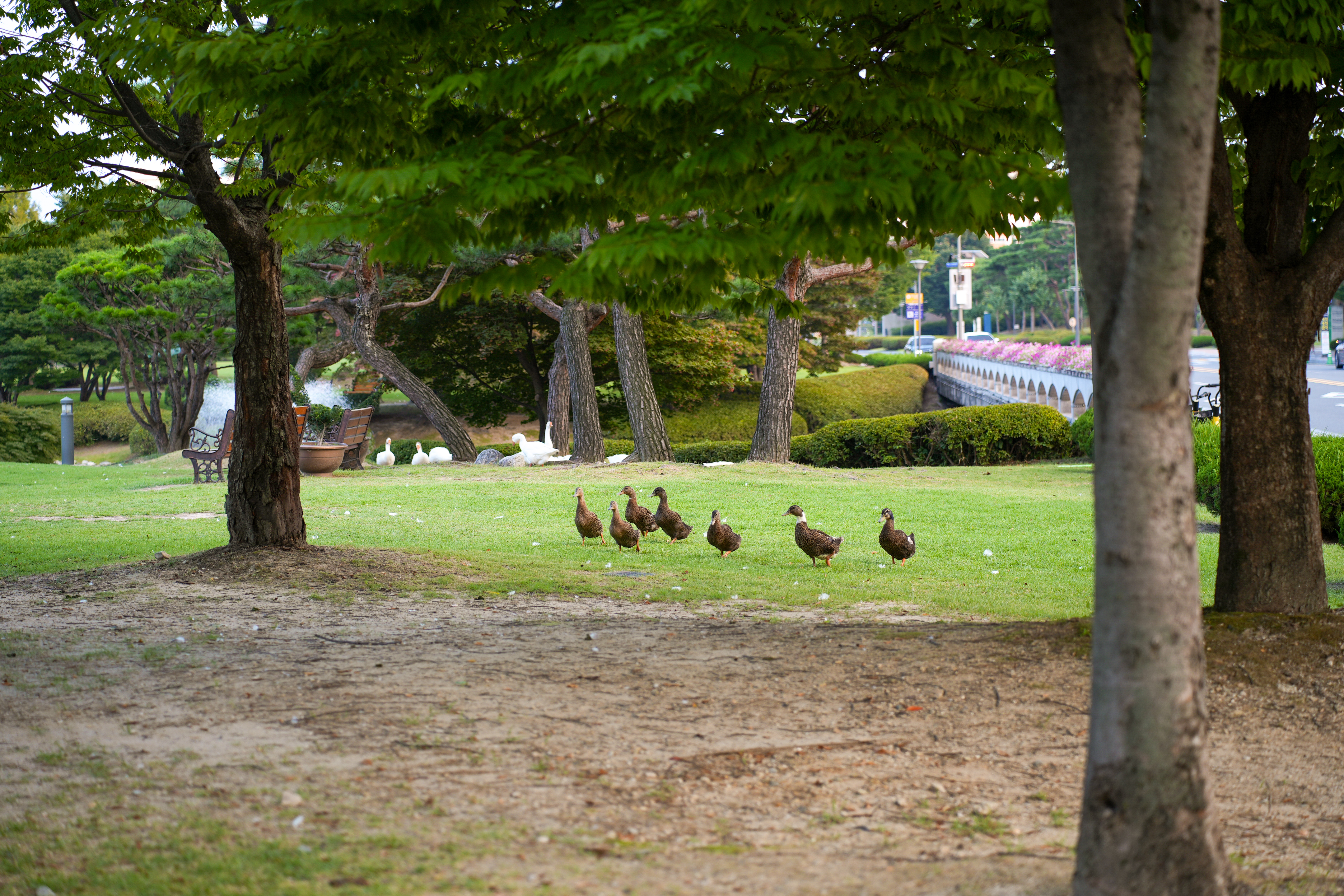 학교에서 살고 있는 거위와 오리가 동시에 있는 보기 힘든 장면. 가까운 곳의 어두운 갈색이 오리 무리이고, 뒤쪽에 흰색이 거위들이다.