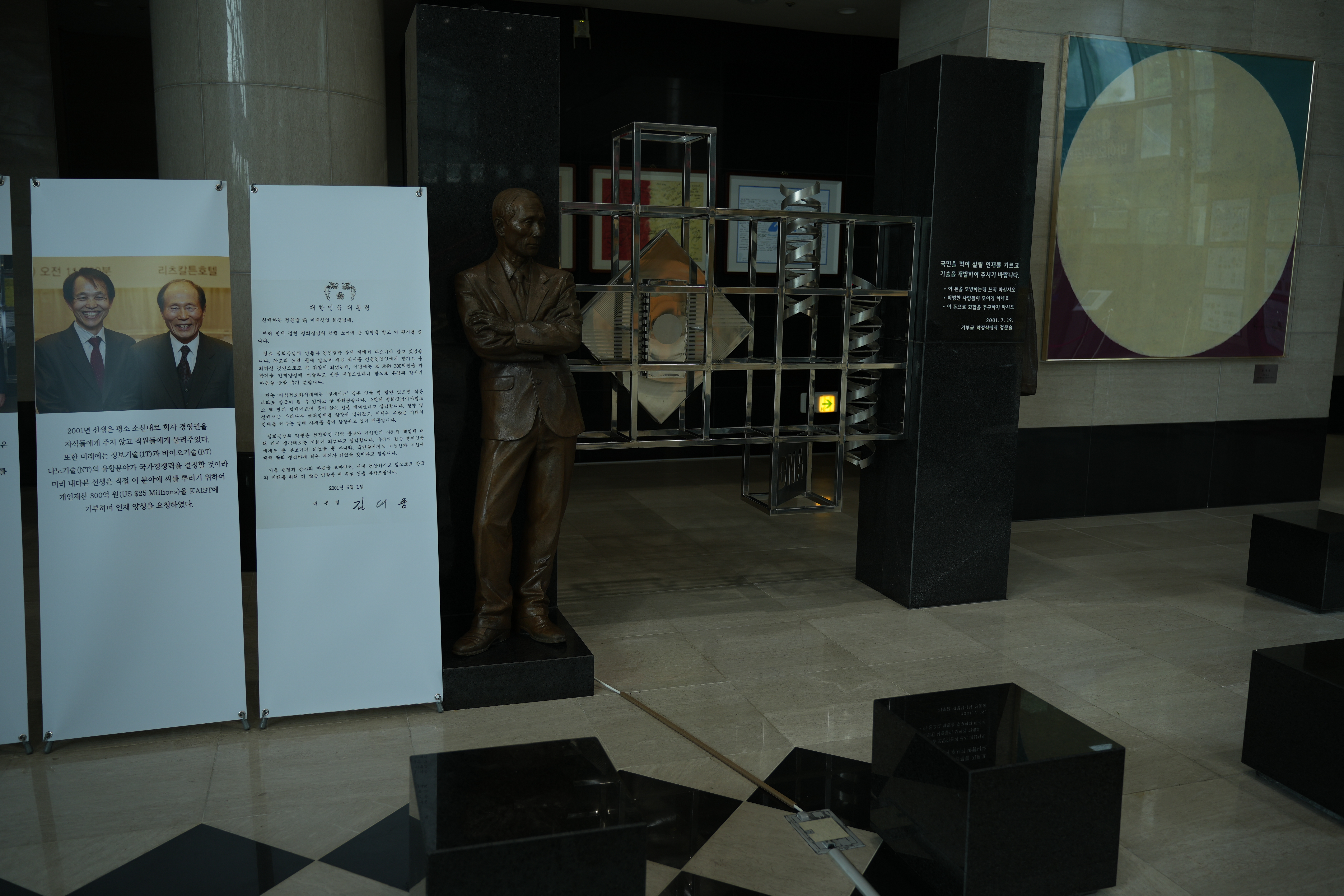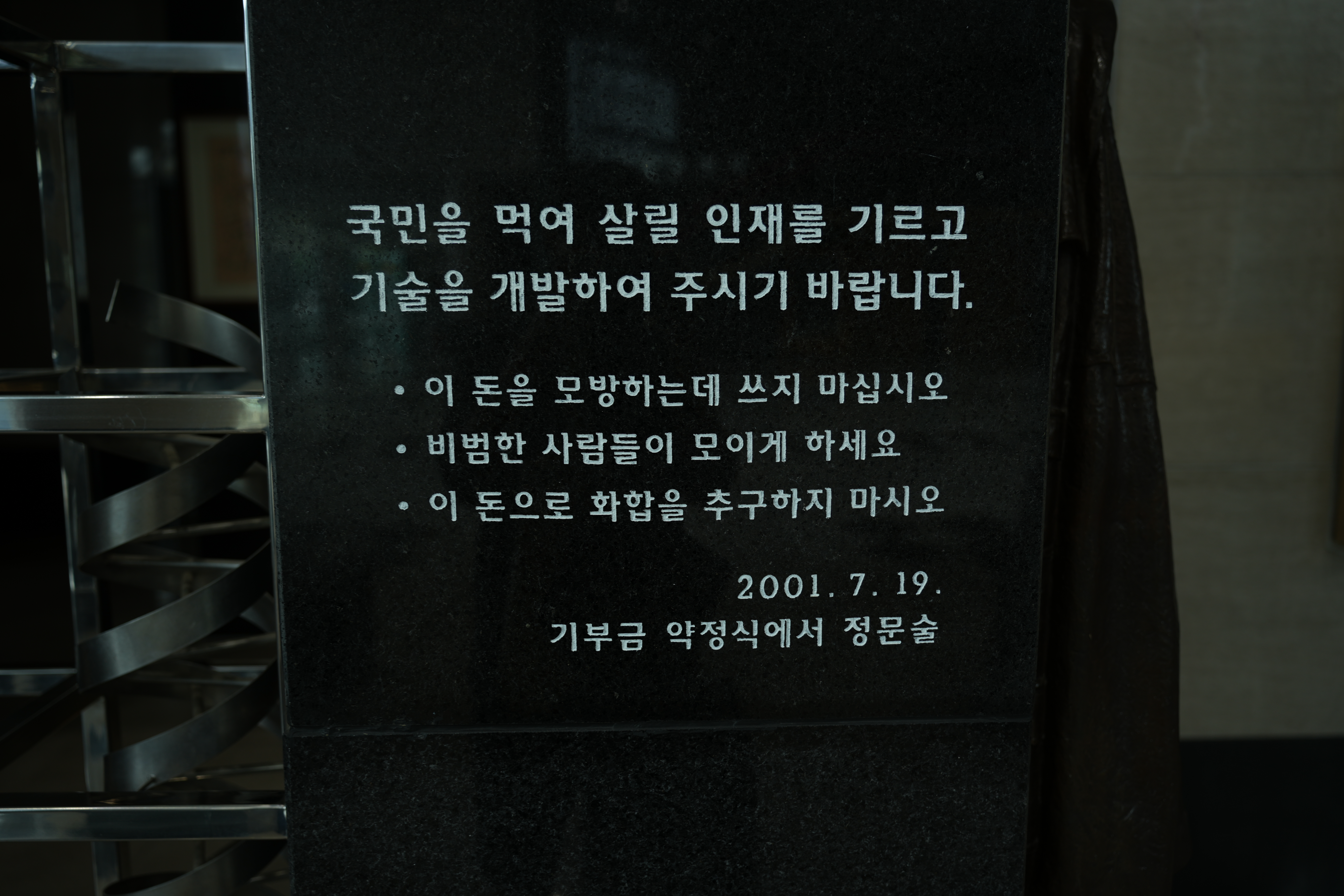 현재 일하고 있는 건물 1층에 있는 문구와 동상. 사람 이름이 정문술이고, 건물 이름도 정문술 빌딩이다. 기부액으로 지어졌고, 안타깝게도 정문술 회장은 얼마 전 별세하셨다. 첫 번째 사진은 추모식날 아침, 화환 세팅되기 전에 찍은 것. 두 번째 사진은 오른쪽의 기둥에 써 있는 문구인데, '이 돈을 모방하는데 쓰지 마십시오' 가 가장 인상적이었다. 매일 지나다니면서 보고 있고, 새로운 연구를 하는 데 동기부여가 된다.