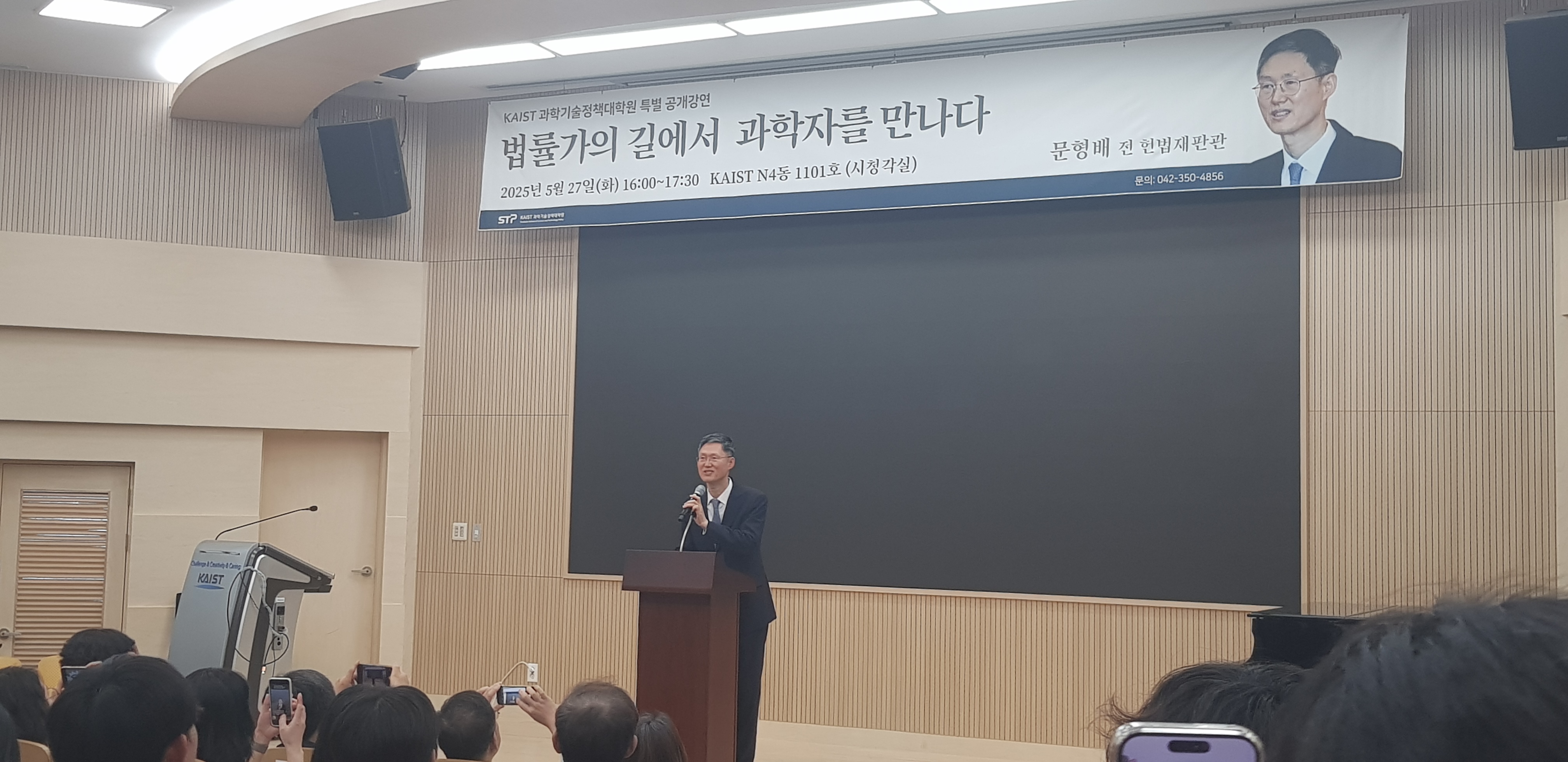 평소 출퇴근하던 길을 걷는데 나무 사이에 걸린 플래카드에서 익숙한 얼굴이 보였다. 문형배 전 헌법재판관이 KAIST에 강연을 온다는 내용이었다. 지난 4월 대통령 탄핵 선고를 생중계로 보기도 했고 이후에 다양한 언론매체에서 헌법재판소와 헌법, 그리고 문형배 개인에 대해서 다루는 것을 많이 접해서 어느 정도는 익숙했지만, 과학기술에 대해 발언한 것을 본 적은 없었던 것 같아서 좀 더 관심이 갔다. 공개강연이라서 사전 신청을 받는다든가 하는 건 없었고, 이후에 받은 이메일에서도 제목만 있고 강연내용에 대한 요약문 같은 게 전혀 없어서 과연 일생을 판사의 길만 걸어온 사람이 과학자와 공학자에게 어떤 말을 하려고 하는 걸까? 매우 궁금해졌다.