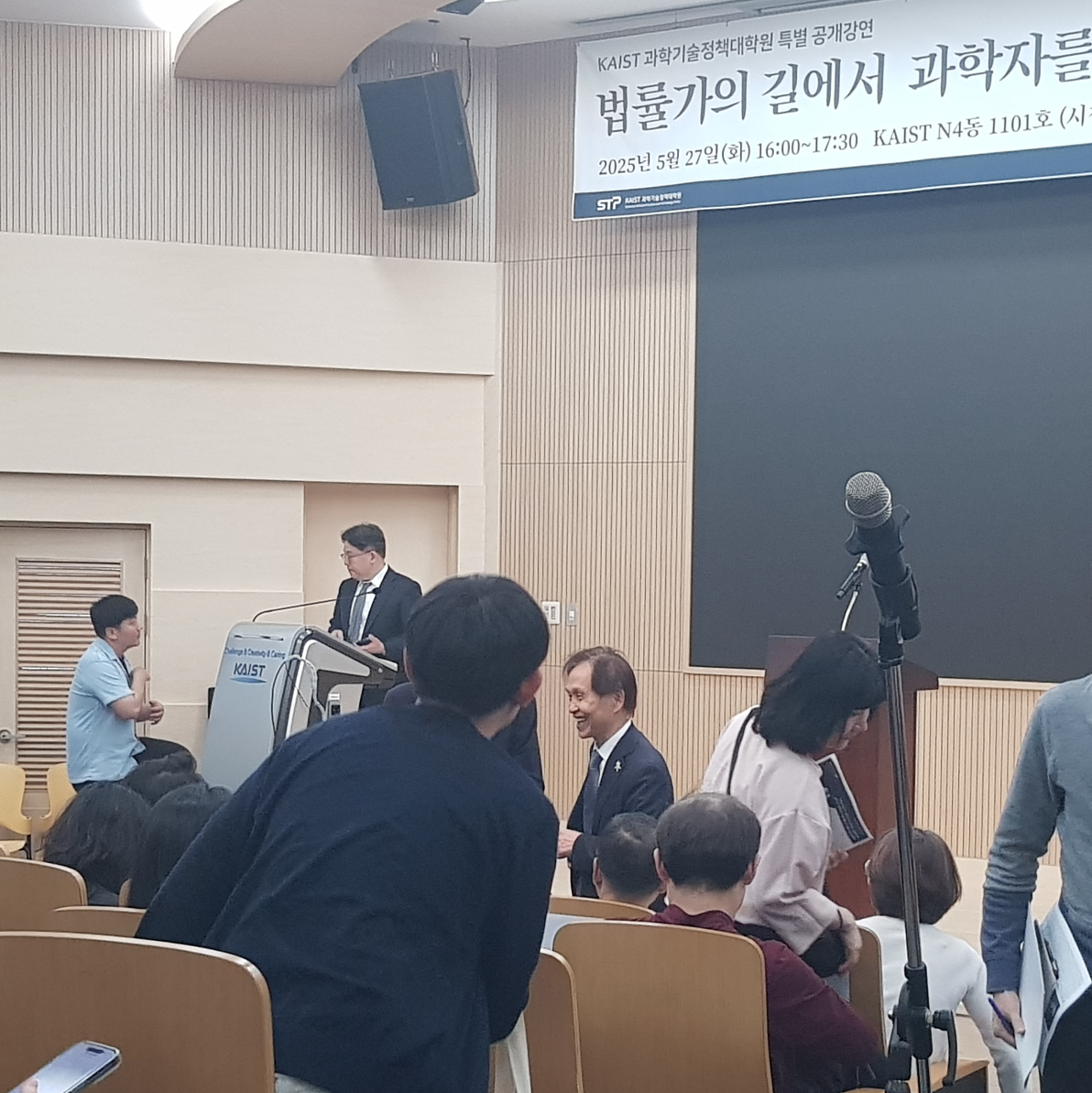 강연 중에 은근슬쩍 와서 빈자리에 앉은 KAIST 총장의 모습과 강연 이후에 드디어 만남이 성사되는 모습 (사진을 찍었는데 하필 자리에서 일어난 사람이 둘의 만남을 가려버렸다...)을 다음 사진들에서 확인할 수 있다.