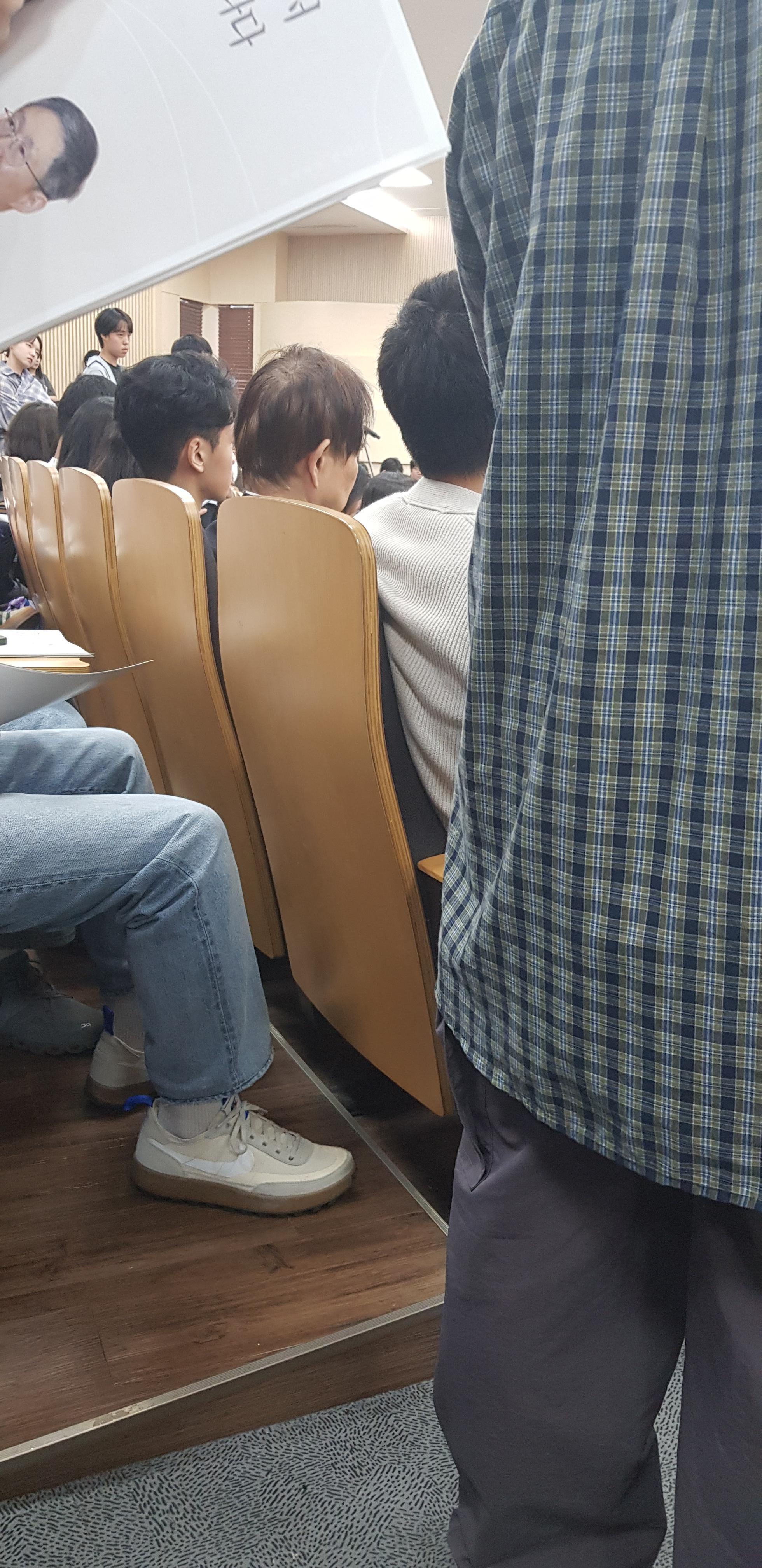 남는 시간 동안 입구에서 집었던 책자를 읽었는데, 첫 장부터 한자가 섞인 딱 봐도 어려워 보이는 문서였고, 법 조항과 판례까지 섞여 있는 13쪽짜리 딱딱한 글이라 읽는 데 꽤 시간이 걸렸다. 참고자료일 것으로 생각하고 큰 그림만 파악했는데, 내용은 현행 헌법의 한계를 과학기술로 해결할 수 있다는 취지였다. 문서로 첨부하겠지만, 솔직히 읽어도 이걸 가지고 한 시간 반짜리 강연에서 무슨 말을 할지가 감이 오지 않았다. 나는 법이나 인문학에 조예가 깊지 않았어서 사전에 질문할 거리를 생각해 보았으나 마땅히 떠오르는 참신한 질문은 없었다. 그래도 KAIST에는 똑똑한 사람들이 많으니 좋은 질문과 현명한 답을 들을 수 있을 거라고 나름 기대하면서 남은 시간을 보냈다. 그리고 예정된 강연 시각에 딱 맞춰서 내가 앉은 자리 바로 옆 통로를 통해 문형배 씨가 걸어들어옴과 동시에 강연장 전체가 박수 소리로 가득 찼다.